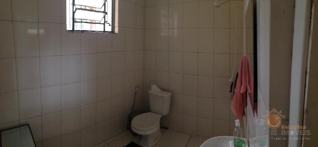 Um quarto amplo revestido em piso cerâmico, banheiro com louças Deca e azulejo até o teto.