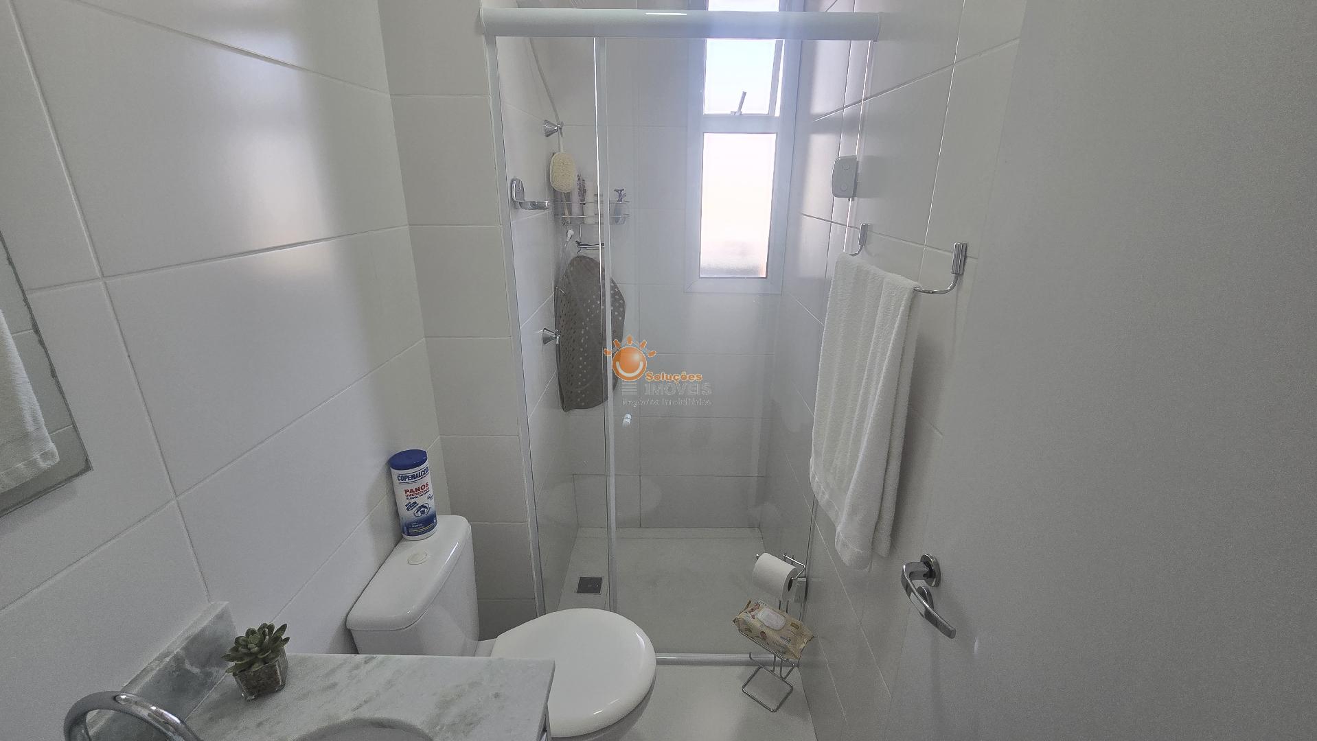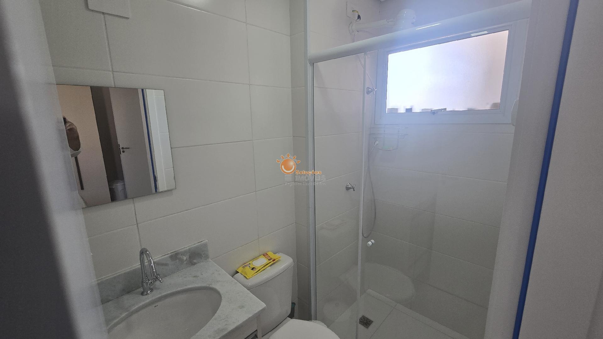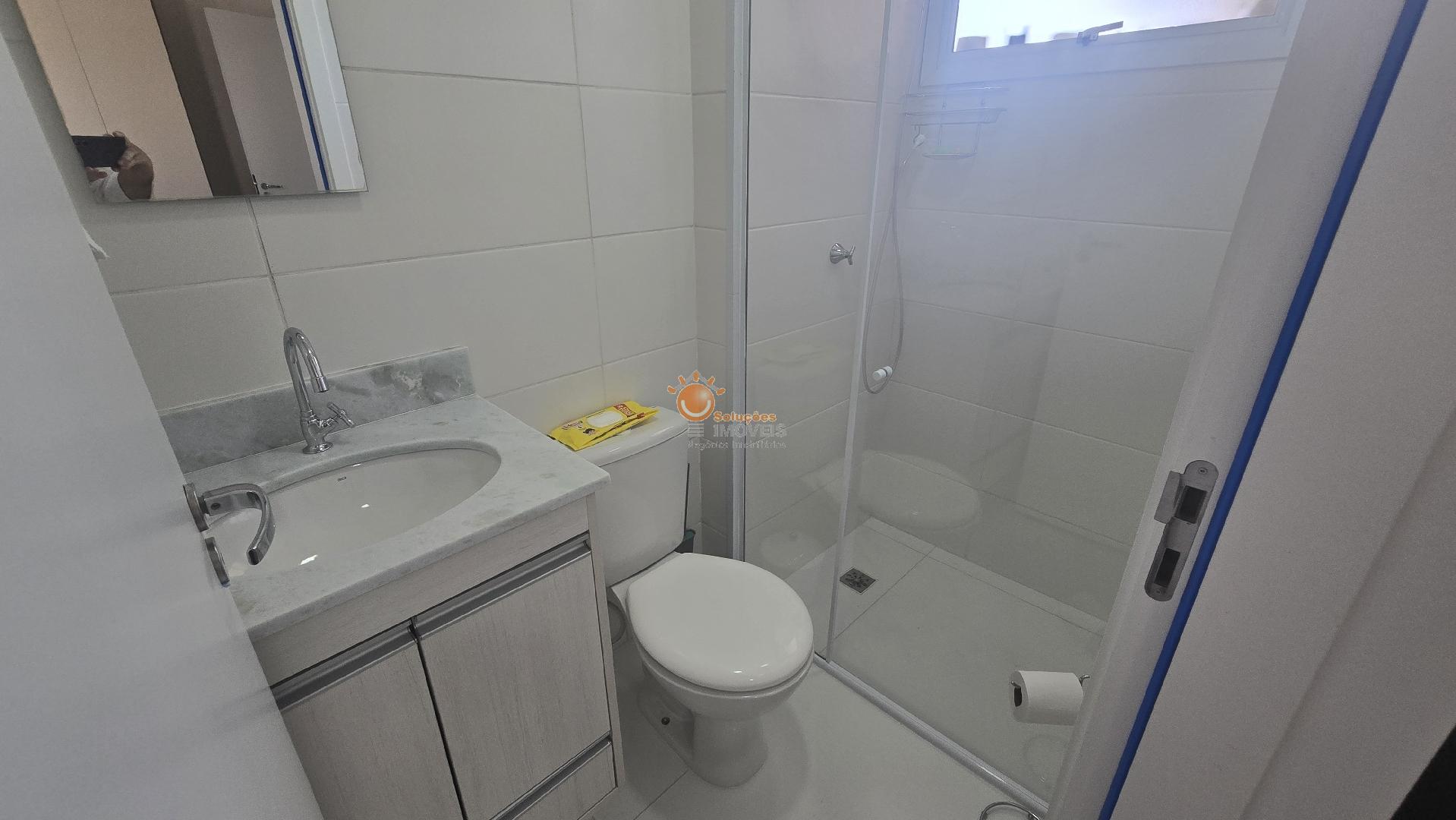 Banheiro social completo, com gabinete e box,