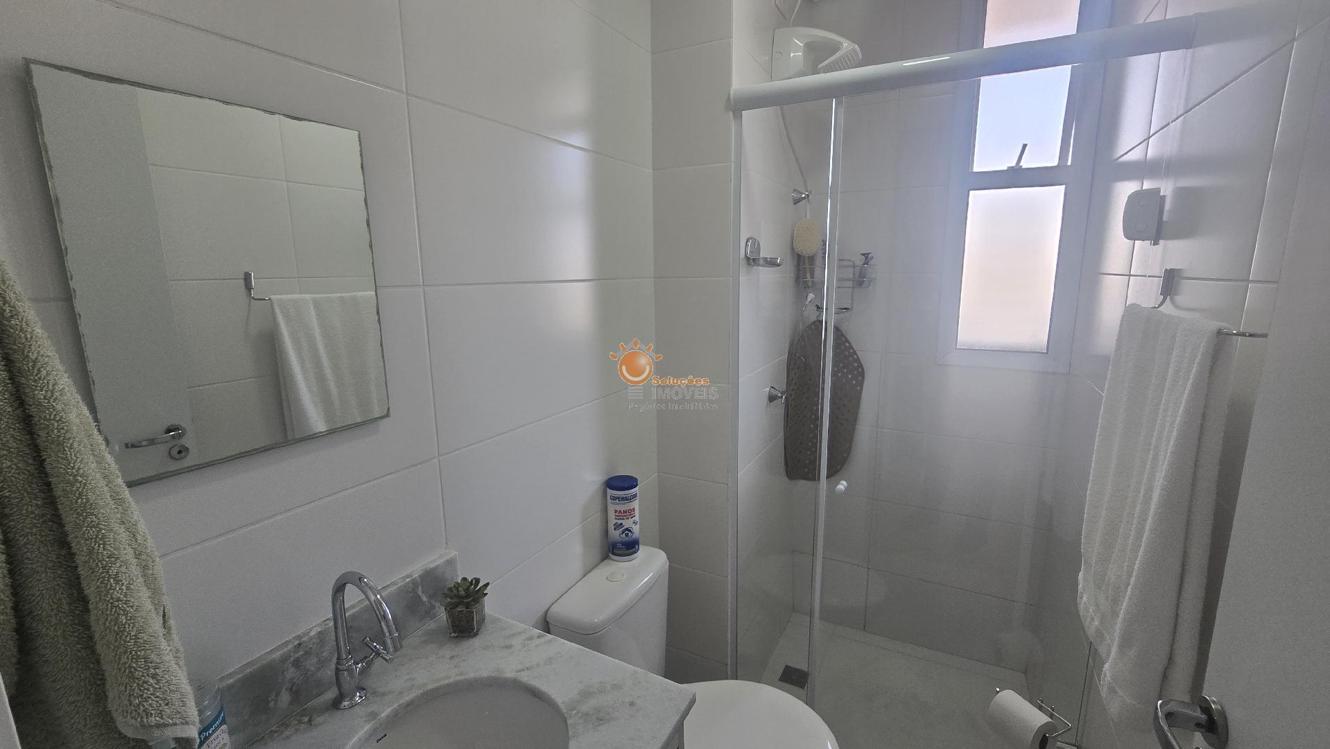 Banheiro social completo, com gabinete e box,